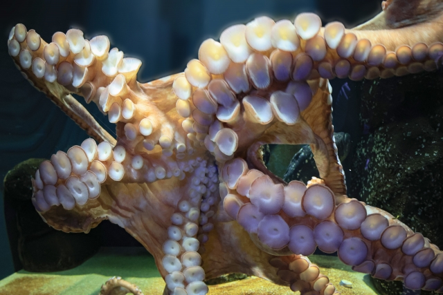 八本の腕には数多くの吸盤が並び、触れる・嗅ぐ・味わうといった感覚を兼ね備えて対象を確かめます。